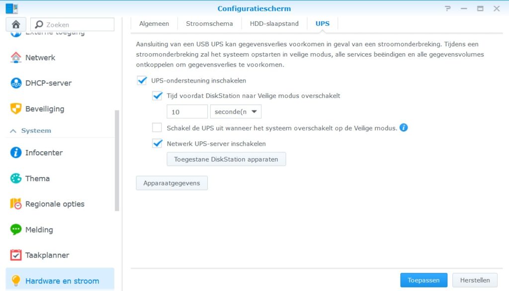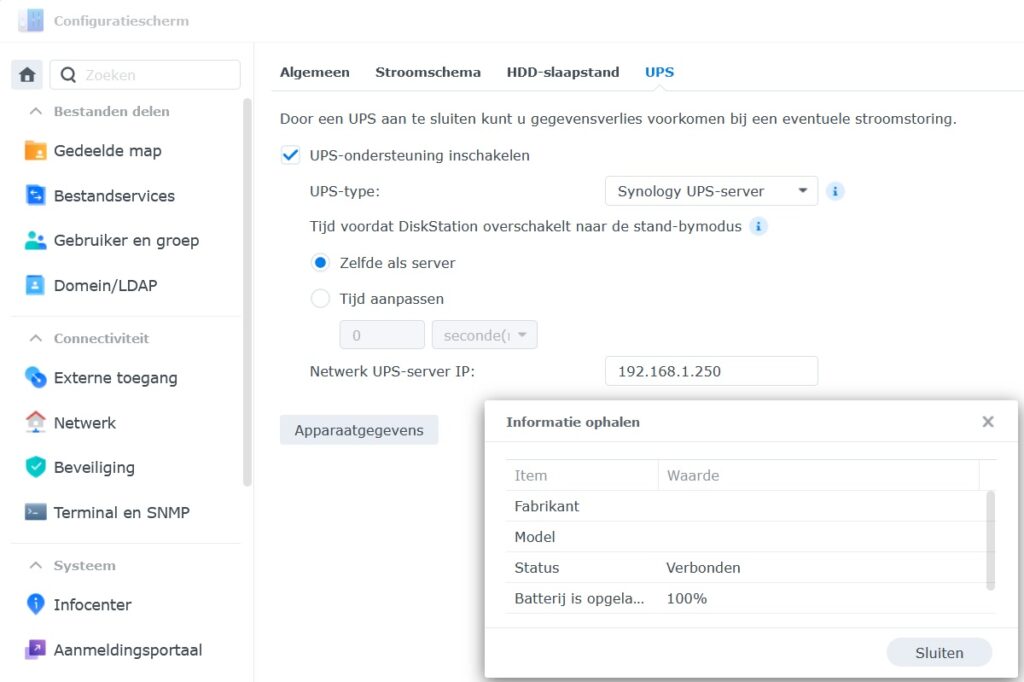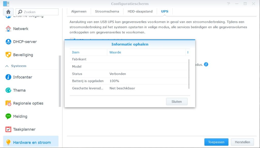 Now I’ ve to test the unit and syno’s on an power outage and this is detected just fine by the Synology DS918+, so on this power outage the NAS goes for an safe shutdown and everything works as expected