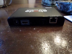 Aan de achterkant zit de power-input, de HDMI aansluiting, IR aansluiting en de LAN aansluiting: