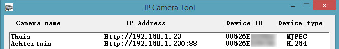 Op de bijgeleverde CD-ROM staat het programma ‘IP-camera tool.exe’. Dit programma gaat op zoek naar aangesloten camera’s in het netwerk. Door het programma uit te voeren, krijg je een overzicht van de aangesloten camera’s in het netwerk: