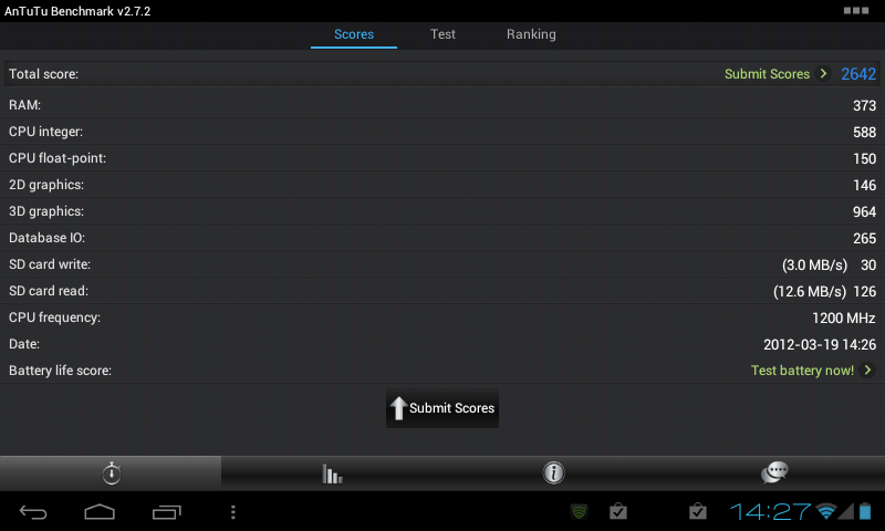 De hardware voelt degelijk aan. De ruime zwarte rand rondom het scherm is prettig — je kunt de tablet vasthouden zonder het scherm onbedoeld te activeren. Af en toe reageert het capacitieve scherm niet goed: de geregistreerde aanraking komt niet overeen met de positie (dit trad ook al op voordat er een barst in het scherm kwam). Dat kan vervelend zijn in bepaalde situaties. De drie menuknoppen voelen erg plastic en je voelt de microswitch er direct doorheen — ik vraag me af hoe lang ze meegaan. Zelfde geldt voor power en volume knoppen. Voordeel: veel knoppen zijn ook software-toetsen (zeker sinds ICS). De Pro 3 leverde ik met Android 2.3.4 (Gingerbread). Dit werkte goed, maar sommige apps zijn in de Market niet zichtbaar omdat de build.prop specificaties niet overeenkomen met app vereisten — terwijl apps vaak wel gewoon zouden werken. De tablet is af fabriek geroot. Gingerbread is primair voor smartphones ontworpen; je voelt dat het een ‘grote telefoon’ is. Met de ICS-update wordt het een echte tablet-ervaring. Een bekende klacht is dat Wi-Fi soms uitvalt. Een reboot lostte dat regelmatig op. De algemene werking is verder erg goed — veel apps draaien soepel. Angry Birds loopt goed (soms kleine hapering). Voor AnTuTu benchmark resultaten (ICS) zie AnTuTu.